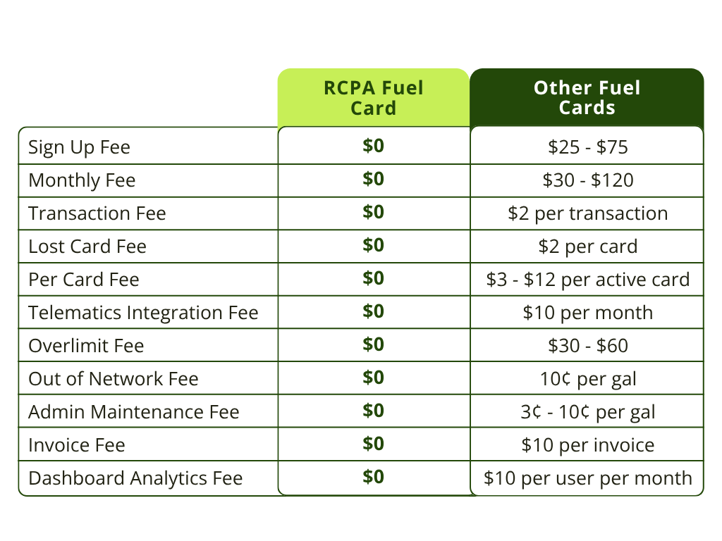 The RCPA Fuel Card has NO monthly membership fees, transaction fees, per-card fees, signup fees, or lost card fees.